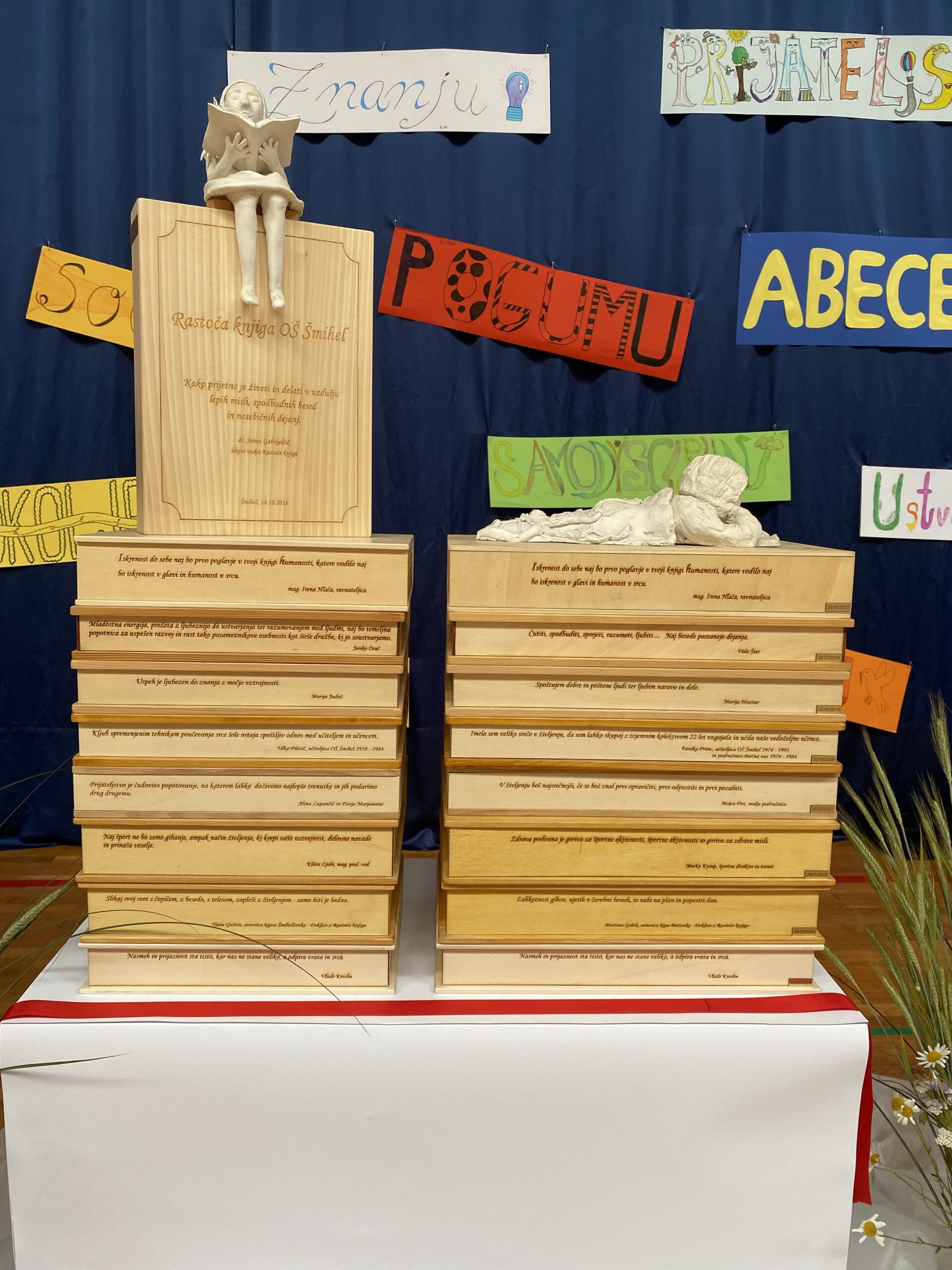 Slavnostni govorec in predstavnik državnega sveta, pisatelj Tone Peršak, ter idejni oče projekta, dr. Janez Gabrijelčič sta izpostavila tri vrednote – ljubezen, knjigo in jezik. Šmihelčanka in Birčanka – kipca deklic z Rastočo knjigo, ki na vhodu pozdravljata obiskovalce obeh šol, sta tako na prireditvi zrasli še za eno stopničko – 8. podstavek.