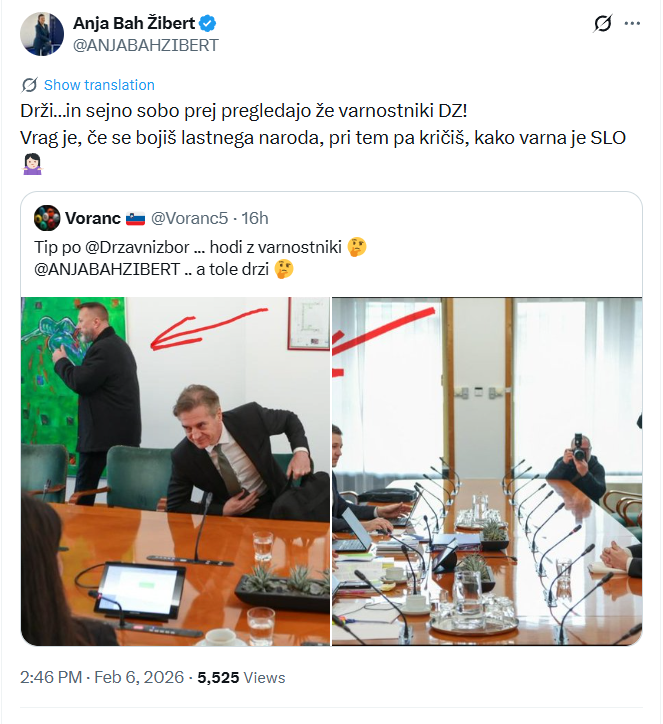 “Sejo sobo prej pregledajo že varnostniki DZ! Vrag je, če se bojiš lastnega naroda, pri tem pa kričiš, kako varna je Slovenija.” (Anja Bah Žibert)
