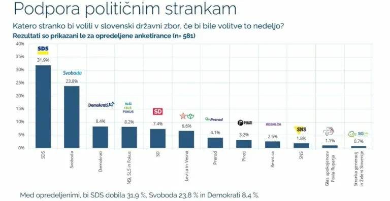 Vodilna opozicijska stranka Slovenska demokratska stranka (SDS) močno vodi, z velikim zaostankom sledi osrednja leva stranka Gibanje Svoboda, sledijo Demokrati Anžeta Logarja ter koalicija Nova Slovenija (NSi) + Slovenska ljudska stranka (SLS) + Focus.
