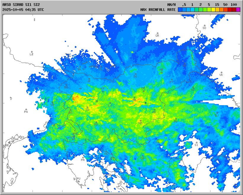 Radarska slika padavin, 5. oktober 2025 ob 4.35 (vir: Arso)