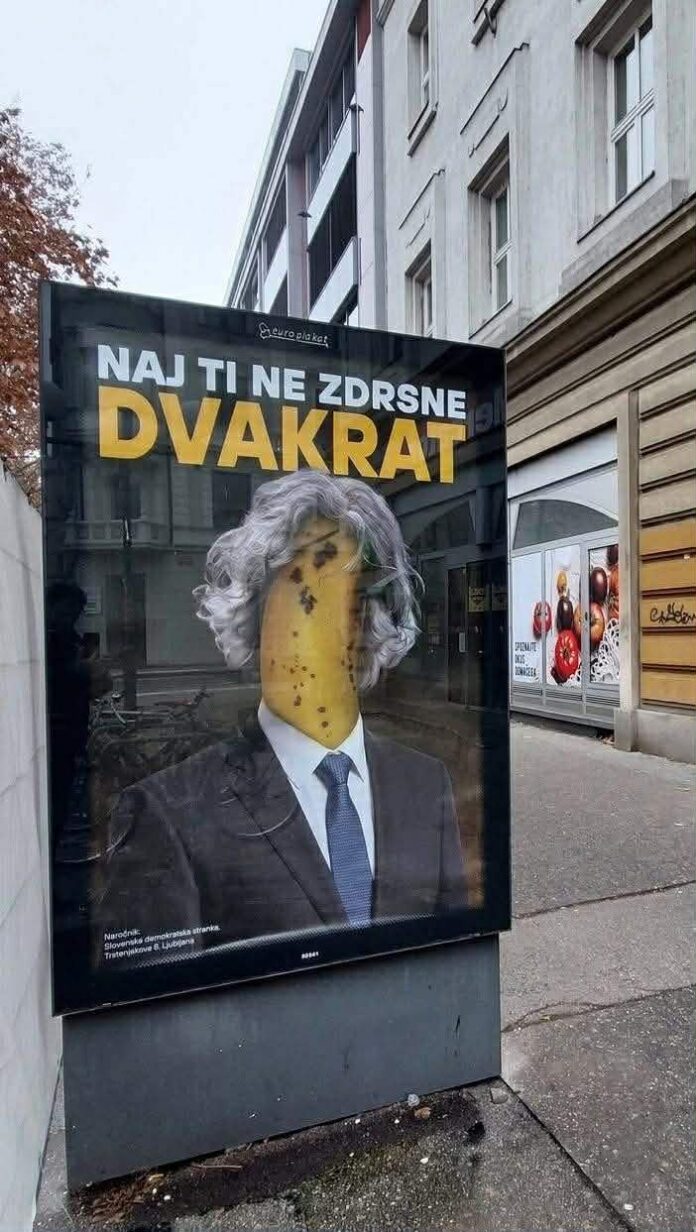 V predvolilnem času, ko politične stranke iščejo vedno nove načine, kako pritegniti pozornost volivcev, je SDS posegla po domiselni vizualni in simbolni rešitvi. Na enem izmed plakatov, ki so se pojavili, je upodobljena figura v obleki in kravati, namesto obraza pa ima banano, dopolnjeno s prepoznavno sivo pričesko. Nad podobo je zapisano: »Naj ti ne zdrsne dvakrat.«