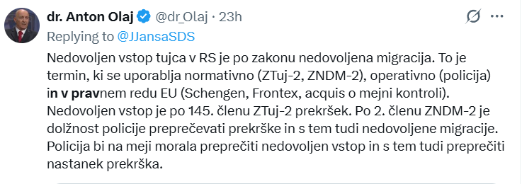 Dr. Anton Olaj, nekdanji generalni direktor Policije, tudi nekdanji direktor PU Novo mesto, pa že ves čas opozarja, da je “nedovoljen vstop tujca v Republiko Slovenijo po zakonu nedovoljena migracija. To je termin, ki se uporablja normativno (ZTuj-2, ZNDM-2), operativno (policija) in v pravnem redu EU (Schengen, Frontex, acquis o mejni kontroli). Nedovoljen vstop je po 145. členu Zakona o tujcih (ZTuj-2) prekršek.