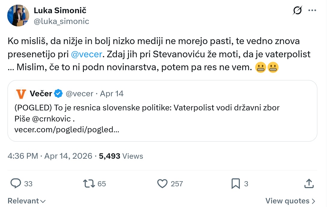 Za vrhunec tega “tekmovanja” je zagotovo poskrbel levičarski Večer, ki je Stevanovića označil za vaterpolista, ki se je povzpel na vrh državnega zbora. Pri tem ga ni zanimalo, kakšno izobrazbo ima Stevanović, niti ne, kakšne so njegove dosedanje politične izkušnje, kar je denimo pomembno za tako funkcijo, pač pa so na Večeru izpostavili zgolj to, da je Stevanović vaterpolist in ga poskušali diskreditirati zgolj na podlagi tega dejstva. Kar so nekateri na družbenih omržejih že označili za novo dno slovenskih večinskih levo usmerjenih medijev.