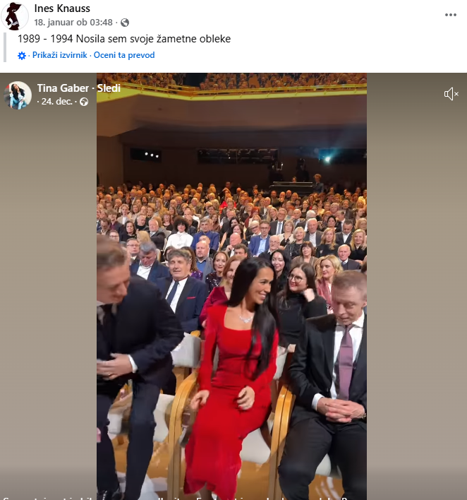 Objavila je posnetek, na katerem je Tina Gaber v rdeči obleki in pripisala: “1989 – 1994 Nosila sem svoje žametne obleke”. In dodala, da je obleko oblikovala ona, izdelala pa jo je njena mama. Objava Ines Knaus je dostopna na povezavi: (20+) Facebook. Zdaj pa je v takšno kreacijo oblečena Tina Gaber, kar pomeni, da posnema sestri Knaus.