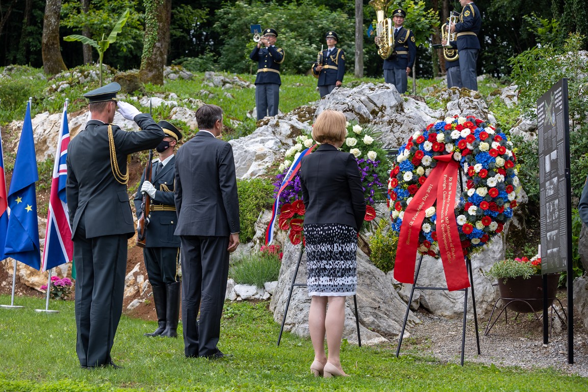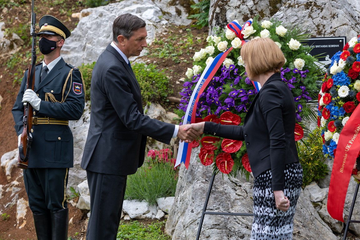 Predsednik Pahor in ministrica Mortonova sta ob tej priložnosti ob spominsko ploščo položila venec v spomin britanskim letalcem.