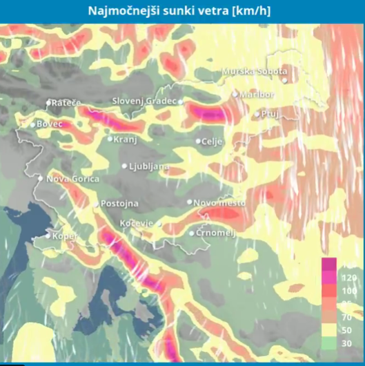 Burja na Primorskem bo najmočnejša v četrtek zjutraj, severni veter na Gorenjskem, Koroškem, Štajerskem in v Prekmurju pa v četrtek popoldne, v noči na petek in še v petek čez dan. Za omenjena območja smo izdali vremensko opozorilo druge stopnje pred močnim vetrom.