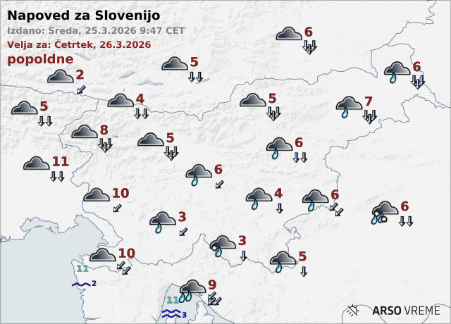 Agencija RS za okolje (Arso) je objavila, da bo v noči na četrtek Slovenijo dosegla izrazita hladna fronta in nam prinesla burno vremensko dogajanje.Popoldne bo povečini sončno, pihal bo južni do jugozahodni veter. Najvišje dnevne temperature bodo od 14 do 20 °C.