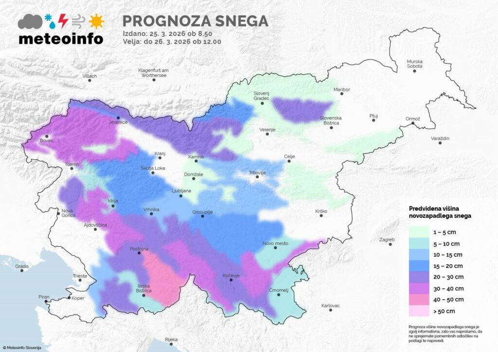 Najmočneje bo snežilo v gorah, predvsem na območju Julijskih Alp, vzdolž grebena Javornikov proti Snežniku in na Kočevskem, pa tudi v Kamniško-Savinjskih Alpah, na Pohorju in na Gorjancih.