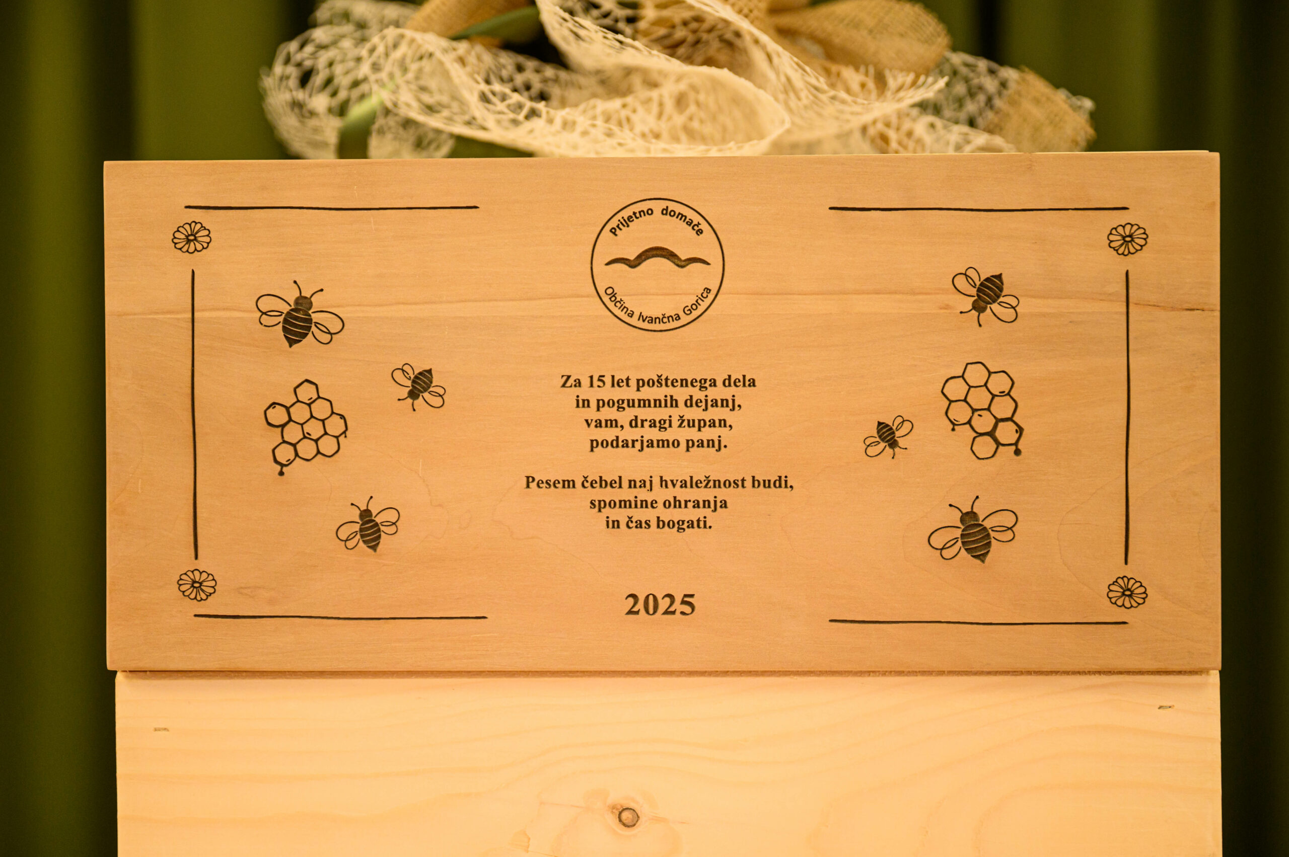 Sodelavci občinske uprave sm mu ob jubileju in prazniku izročili čebelarski AŽ panj s personalizirano panjsko končnico in medovito drevo, kot simbol marljivosti, skupnosti in skrbi za prihodnost.