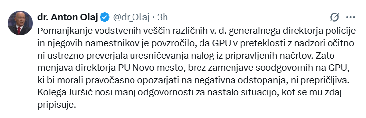 Tako je današnji odstop Igorja Juršiča, generalnega direktorja Policijske uprave Novo mesto, na omrežju X komentiral dr. Anton Olaj.