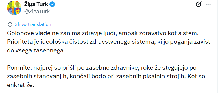 “Golobove vlade ne zanima zdravje ljudi, ampak zdravstvo kot sistem. Prioriteta je ideološka čistost zdravstvenega sistema, ki jo poganja zavist do vsega zasebnega. Pomnite: najprej so prišli po zasebne zdravnike, roke že stegujejo po zasebnih stanovanjih, končali bodo pri zasebnih pisalnih strojih. Kot so enkrat že.”