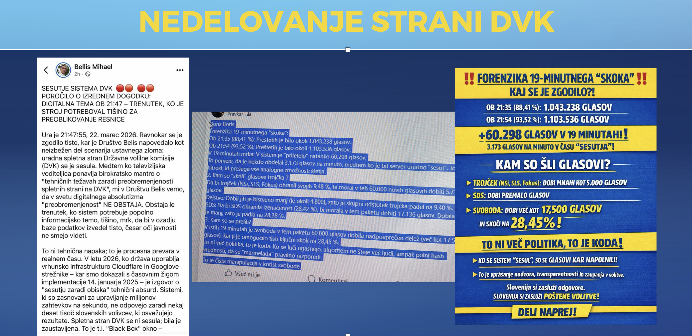 Slovenska demokratska stranka (SDS) je po volitvah v državni zbor zahtevala neodvisno, celovito in strokovno vodeno forenzično preiskavo informacijskega sistema Državne volilne komisije (DVK). Razlog je izpad spletnega sistema DVK na dan volitev, 22. marca 2026, ki se je zgodil v ključnem času objave volilnih rezultatov.