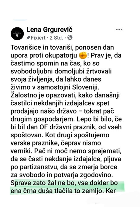 Poslanka Lena Grgurevič (Gibanje Svoboda) je na družbenih omrežjih objavila zapis, ki močno odmeva. Namesto, da bi zdajšnje dni uporabila za resničen razmislek o vojni, žrtvah, odporu in predvsem o povojnih zločinih,