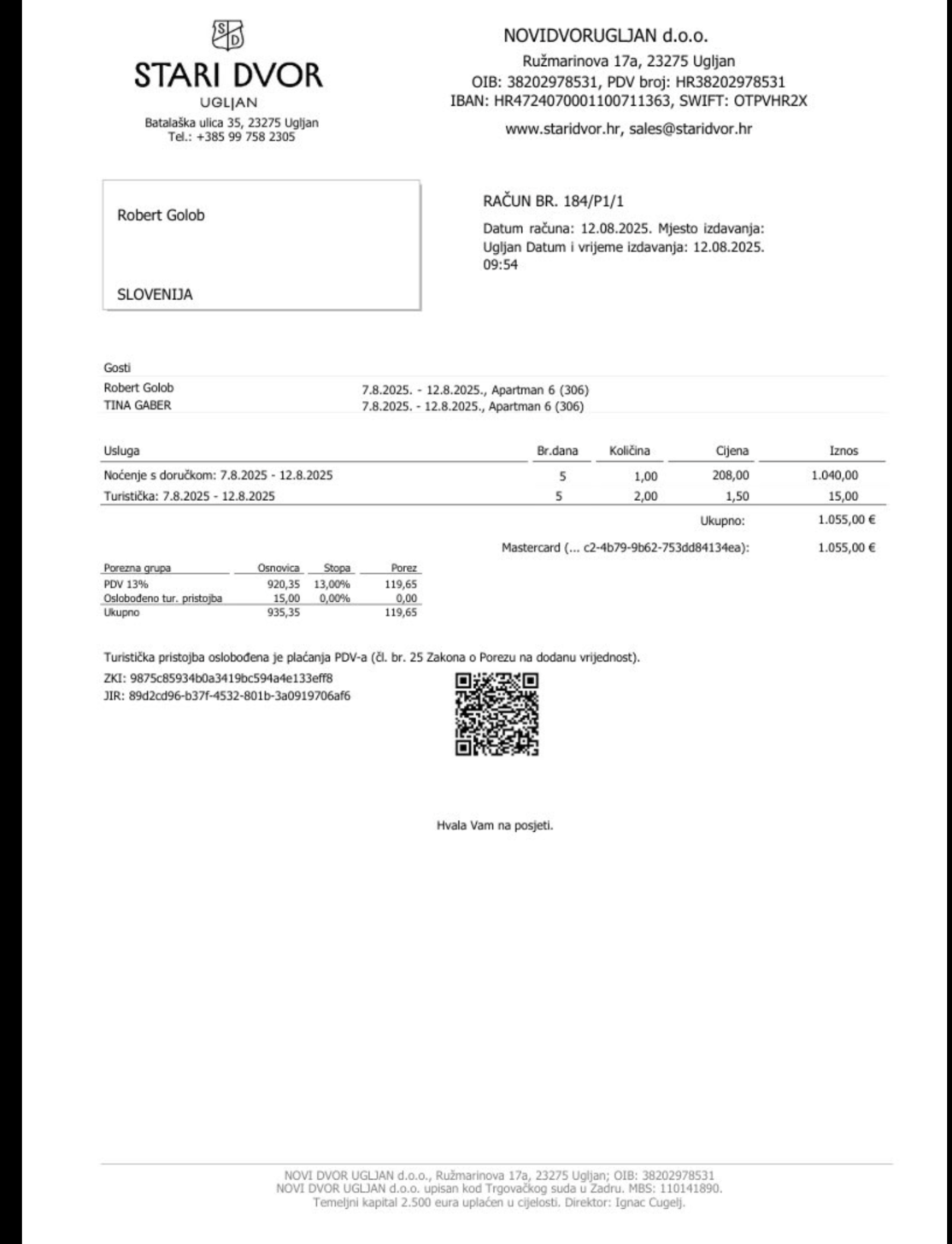 Po tem ko je Tarča razkrila bivanje predsednika vlade na Ugljanu, je Golob objavil račun, da naj bi osebno poravnal račun. Na računu je navedeno plačilo v višini 1055 evrov, način plačila pa je kartica Mastercard.