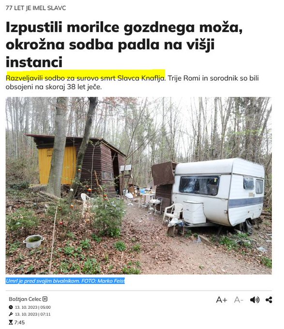 V zadnjih dneh, po tragični smrti 48-letnega Aleša Šutarja v Novem mestu, se na družbenih omrežjih (orkestrirano) valijo zapisi, ki se nanašajo na uboj nesrečnega 77-letnega Slavca. Marca 2021 so ga v gozdu v okolici Grosuplja, kjer je prebival, umorili trije Romi. Napad je bil motiviran z ropom – osumljenci so iskali denar.