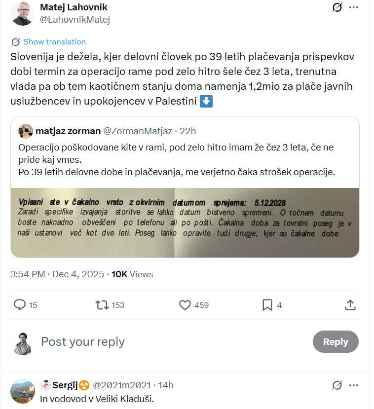 “Slovenija je dežela, kjer delovni človek po 39 letih plačevanja prispevkov dobi termin za operacijo rame pod zelo hitro šele čez 3 leta, trenutna vlada pa ob tem kaotičnem stanju doma namenja 1,2 mio eur za plače javnih uslužbencev in upokojencev v Palestini.”