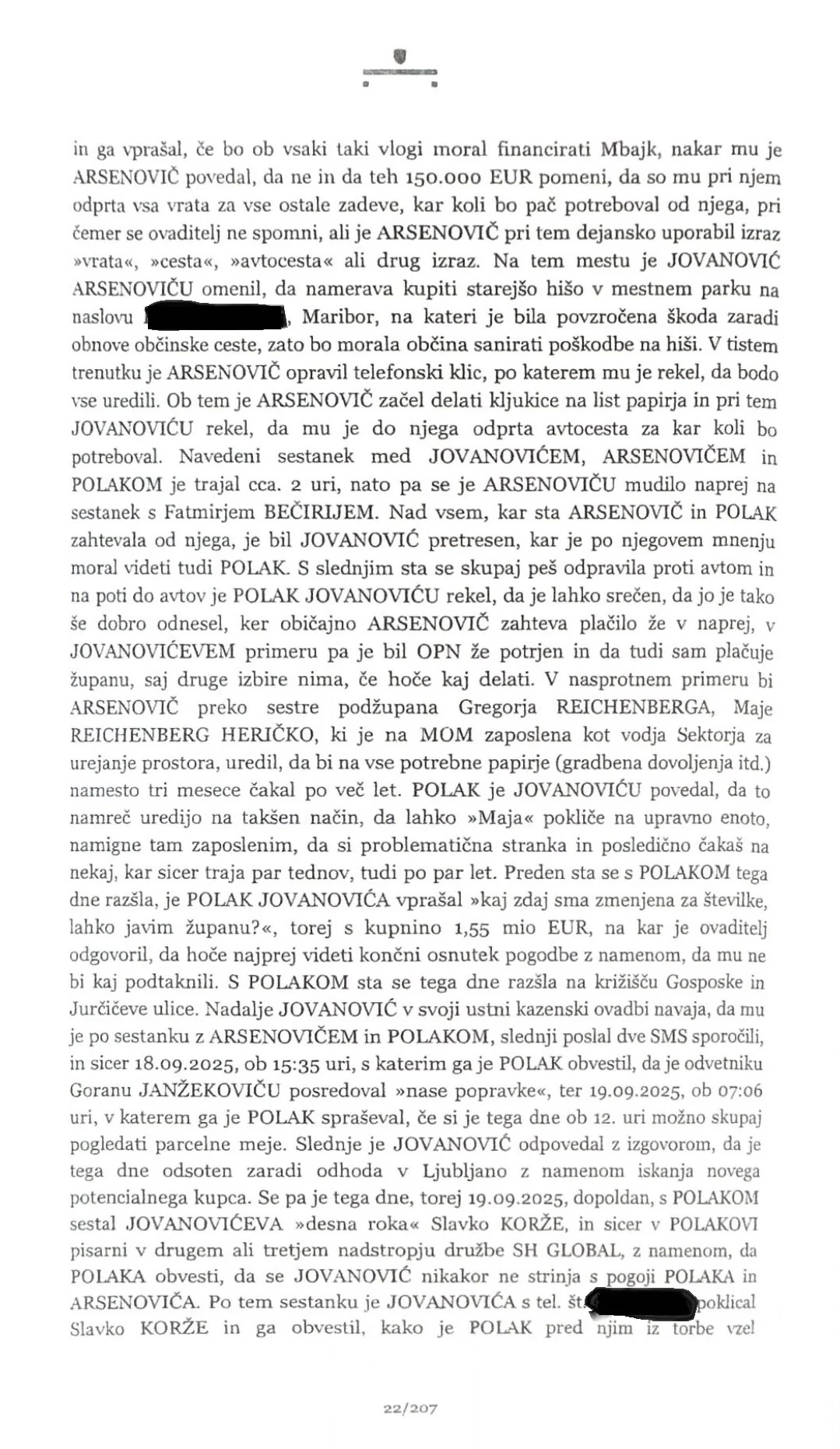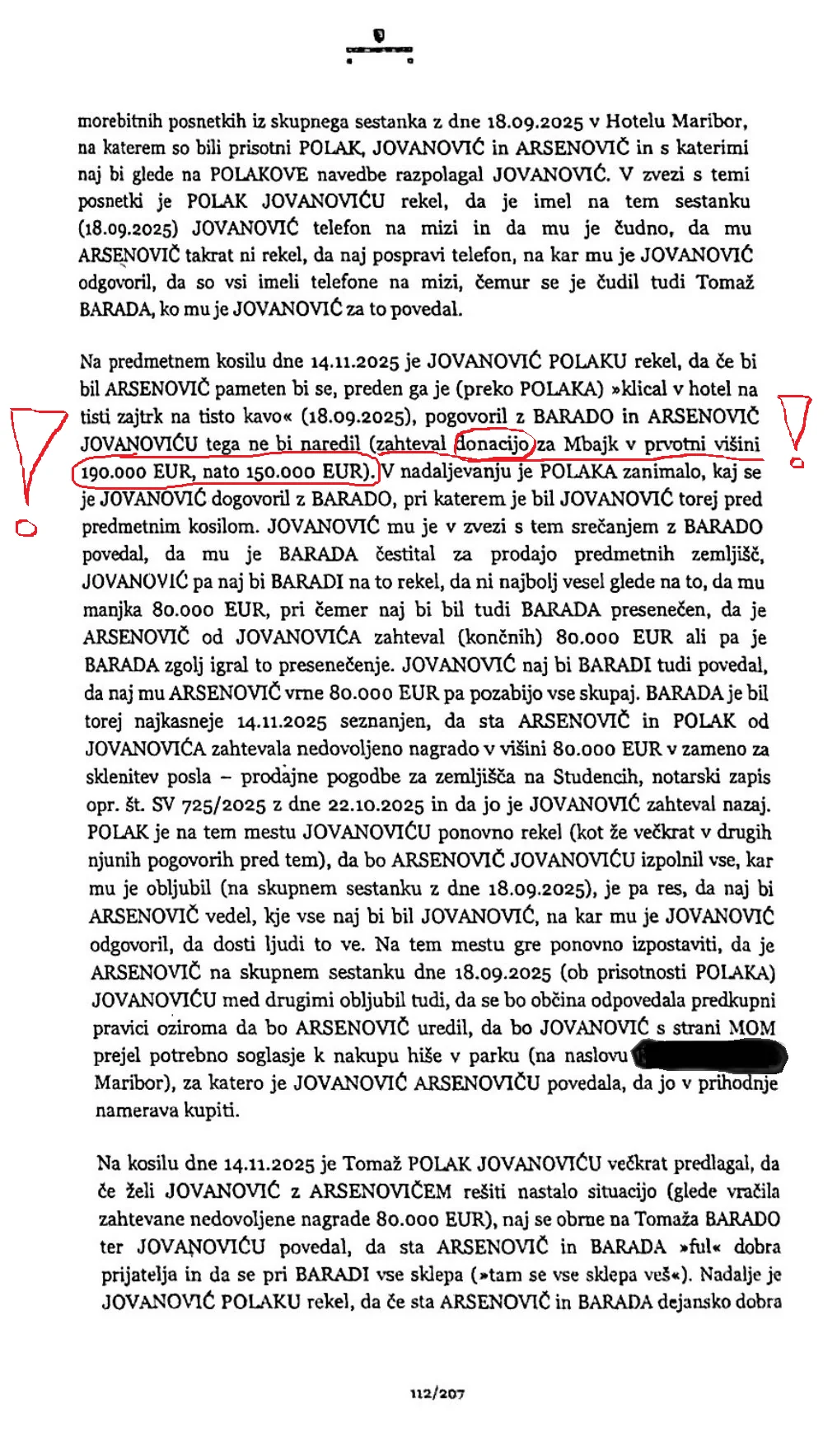 V zahtevi za preiskavo, ki jo je na Okrožno državno tožilstvo v Mariboru vložilo mariborsko državno tožilstvo, je razvidno, da naj bi bil mariborski župan Saša Arsenovič osumljen jemanja podkupnine. Iz dokumentov tožilstva, ki jih je objavil portal Nova24.TV, je razvidno, da naj bi župan zahteval podkupnino v višini 150.000 evrov, pri čemer naj bi bila ta predstavljena kot donacija za projekt mestnih koles Mbajk.