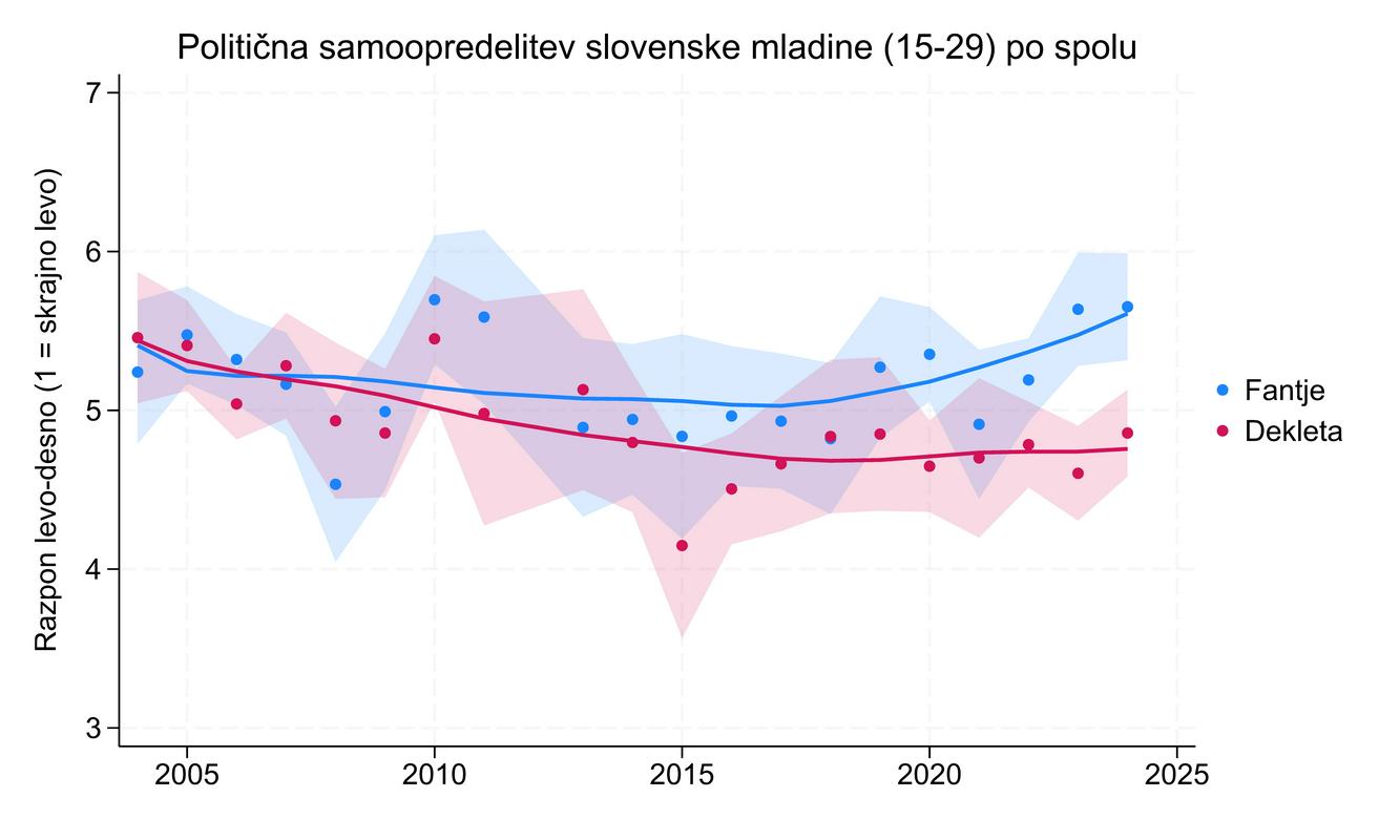 Ena večjih in bolj očitnih sprememb v najmlajšem delu političnega telesa je obrat na desno. Tradicionalno so bili mladi pri nas rahlo bolj levo usmerjeni. Še leta 2018 so bili na lestvici ena od deset, pri čemer je ena skrajno levo in deset pa skrajno desno, v povprečju na točki 4,8 oziroma rahlo levo od sredine. Leta 2024 pa so že kazali nagnjenost k desnemu centru oziroma 5,9 na omenjeni lestvici.