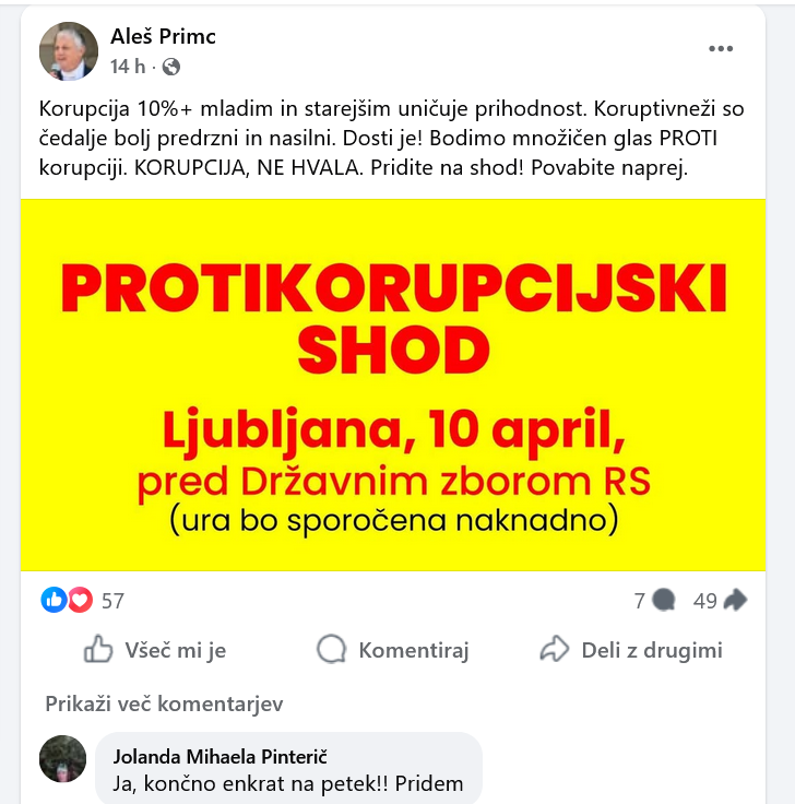 »Korupcija 10 % + mladim in starejšim uničuje prihodnost. Koruptivneži so čedalje bolj predrzni in nasilni. Dosti je! Bodimo množičen glas PROTI korupciji. KORUPCIJA, NE HVALA. Pridite na shod! Povabite naprej,« je sporočil Primc.
