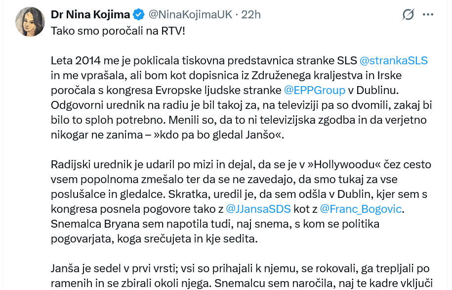 Nekdanja dopisnica RTV Slovenija iz Velike Britanije Nina Kojima je razkrila, kakšen način so imeli na RTV Slovenija do poročanja o dogodkih, ki so se jih udeležili predsednik SDS Janez Janša in drugi desni politiki, ter kako so jih skušali pri tem cenzurirati. Zaradi aktualnosti tik pred volitvami, njen zapis objavljamo v celoti.