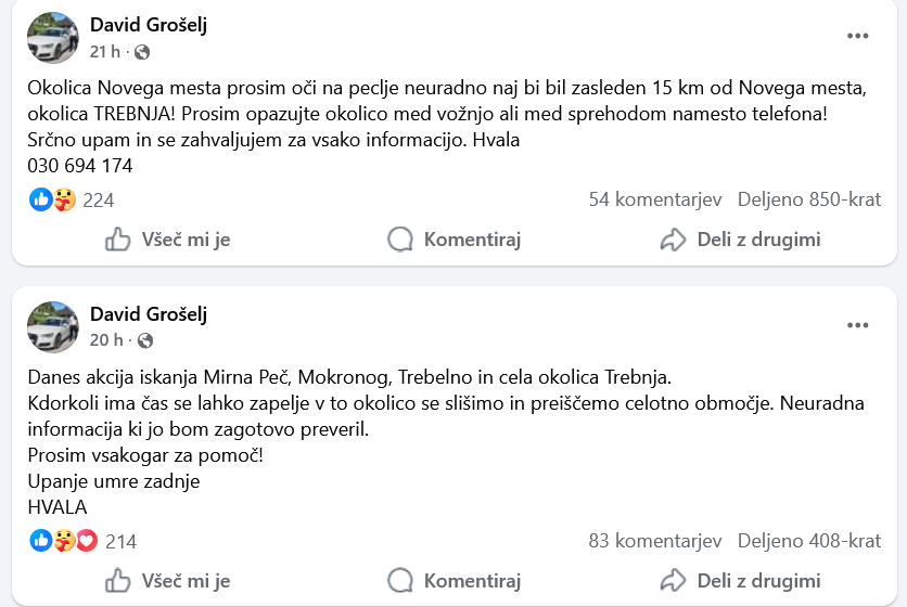 David, ki pravi, da oče ni imel navade takole oditi, prav tako ni popival ali jemal zdravil, je bil pa včasih živčen zaradi službe. Sin na svojem Facebookovem profilu redno objavlja informacije in javnost prosi za pomoč, ponuja celo denarno nagrado. Po eni od informacij, naj bi njegovega očeta nazadnje videli v Trebnjem, a informacija ni preverjena.