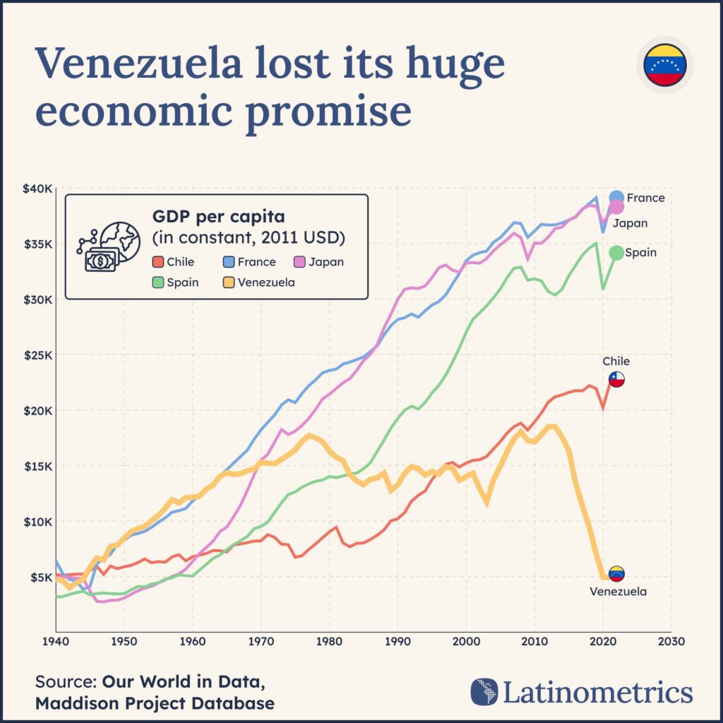 Venezuela je bila v 50. in 60. letih 20. stoletja med najbogatejšimi na svetu (bogatejša kot Španija, Italija in primerljiva s Švico), danes živijo v veliki revščini. Kar se kaže tudi v velikem padcu bruto domačega proizvoda na prebivalca (graf ob koncu prispevka).