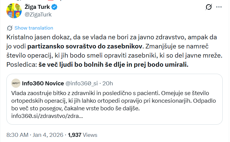 “Kristalno jasen dokaz, da se vlada ne bori za javno zdravstvo, ampak da jo vodi partizansko sovraštvo do zasebnikov. Zmanjšuje se namreč število operacij, ki jih bodo smeli opraviti zasebniki, ki so del javne mreže. Posledica: še več ljudi bo bolnih še dlje in prej bodo umirali.”