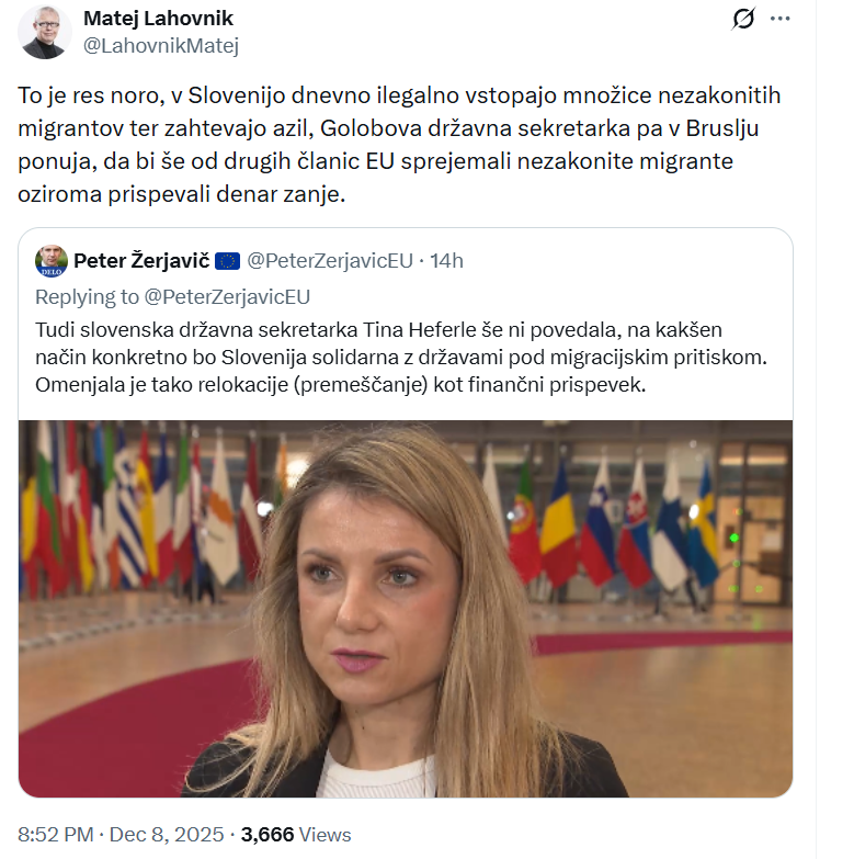 “To je res noro, v Slovenijo dnevno ilegalno vstopajo množice nezakonitih migrantov ter zahtevajo azil, Golobova državna sekretarka pa v Bruslju ponuja, da bi še od drugih članic EU sprejemali nezakonite migrante oziroma prispevali denar zanje.”