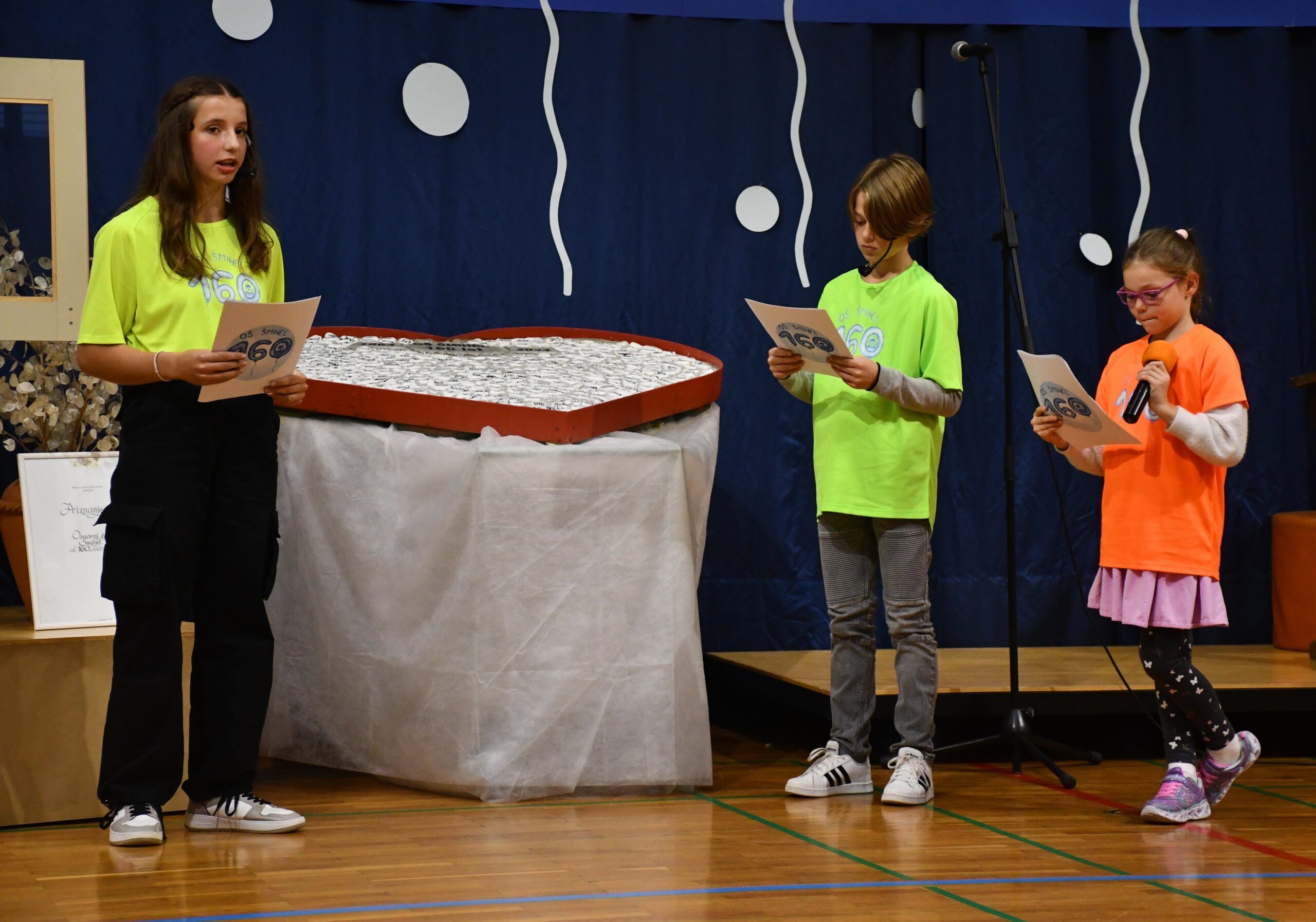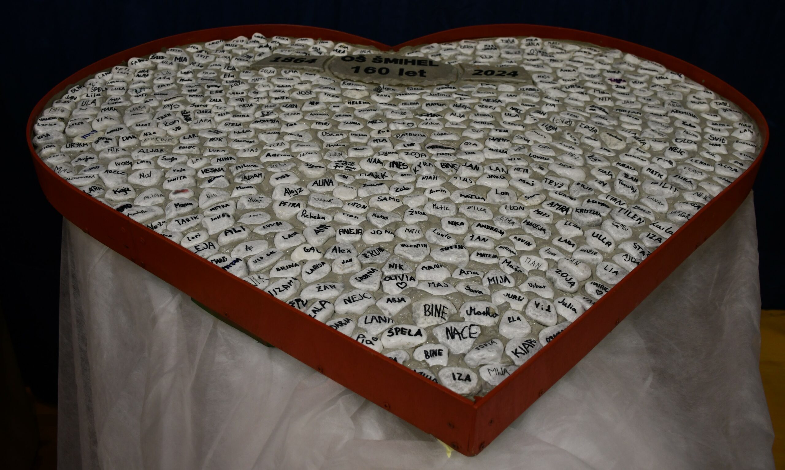 V pestrem in bogatem programu se je zvrstilo veliko število glasbenih in plesnih točk, še poseben aplavz pa si je prislužila skrivnostna pevska točka vseh zaposlenih šole. Namesto torte smo naši slavljenki podarili veliko srce, katerega kamenčki z imeni vseh učencev in delavcev šole, nas bo še vrsto let spominjalo na ta edinstven jubilej.