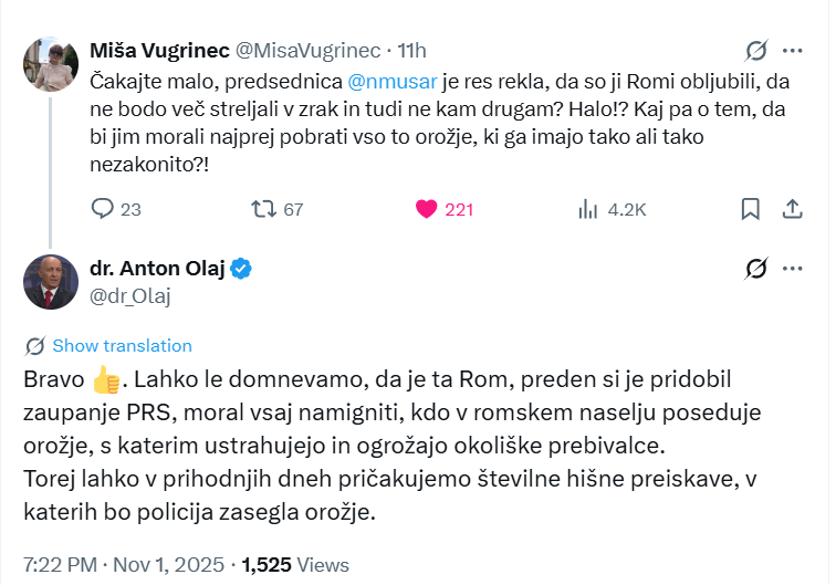 Na X je zapisal, da “lahko le domnevamo, da je ta Rom, preden si je pridobil zaupanje predsednice republike, moral vsaj namigniti, kdo v romskem naselju poseduje orožje, s katerim ustrahujejo in ogrožajo okoliške prebivalce. Torej lahko v prihodnjih dneh pričakujemo številne hišne preiskave, v katerih bo policija zasegla orožje,” je dodal.