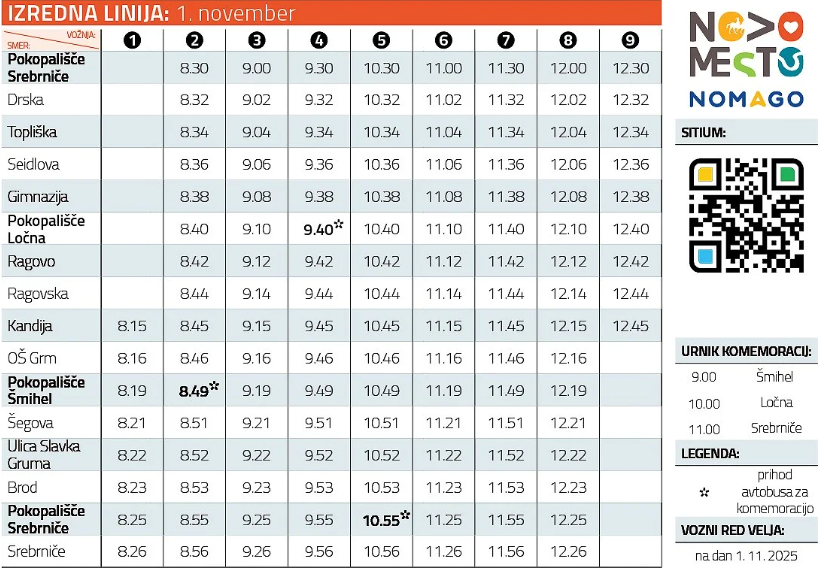 Da se izognete gneči, se lahko do pokopališč brezplačno pripeljete z avtobusom, ki bo prilagojen tudi za gibalno ovirane. Na ta dan bo vzpostavljena brezplačna izredna krožna linija mestnega potniškega prometa, ki bo vsakih 30 minut povezovala vsa tri mestna pokopališča – Srebrniče, Ločno in Šmihel – s parkirišči na Kandiji, Novem trgu in Portovalu. Avtobus bo ustavljal tudi na postajališču pred Osnovno šolo Grm, ki sicer ni v redni uporabi mestnega potniškega prometa. Prihodi bodo usklajeni z začetki spominskih slovesnosti.