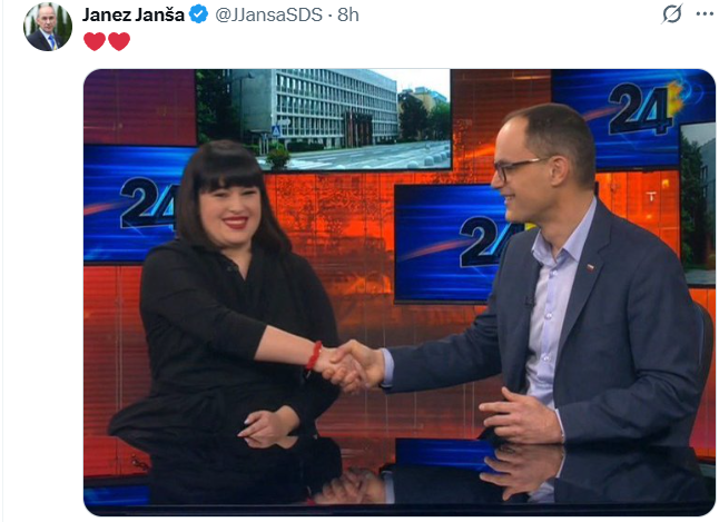 Janez Janša pa je včeraj objavil fotografijo iz oddaje na komercialni televiziji in pripisal srčka. Fotografija namreč nakazuje, da se Nika Kovač in Anže Logar “kregata” zgolj v javnosti, v resnici pa tesno sodelujeta.