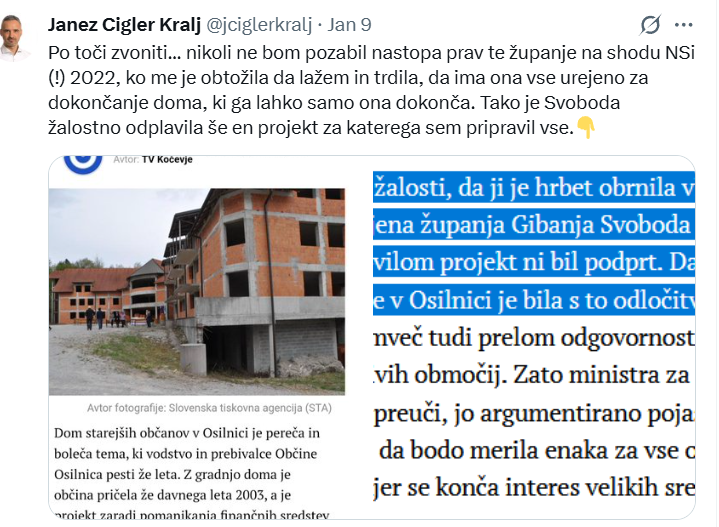 Nekdanji minister Janez Cigler Kralj (NSi) pa je zdaj prek X sporočil: “Po toči zvoniti… nikoli ne bom pozabil nastopa prav te županje na shodu NSi (!) 2022, ko me je (Alenka Kovač – op.) obtožila da lažem in trdila, da ima ona vse urejeno za dokončanje doma, ki ga lahko samo ona dokonča. Tako je Svoboda žalostno odplavila še en projekt za katerega sem pripravil vse.”