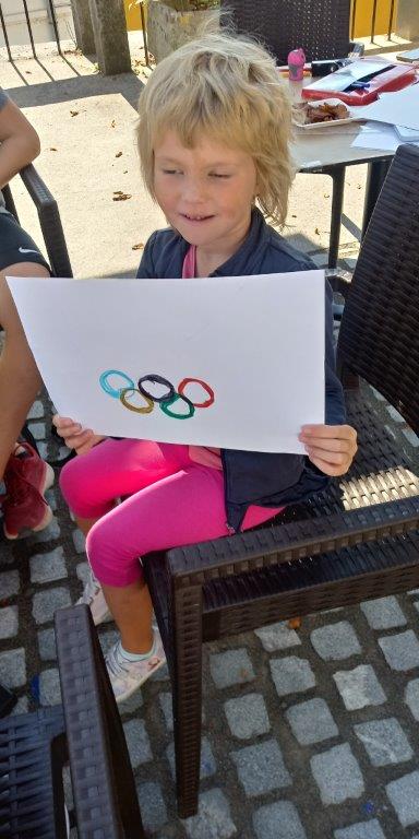 Otroci so skupaj z Ambasadorji športa na ploščadi Trgovinice Breg narisali in pobarvali Olimpijske kroge ter zapisali svoja razmišljanja: POGUM – VSTRAJNOST – SPOŠTOVANJE – ČAST – VZOR – IDOL – OLIMPIJSKA MEDALJA – USPEH – ZDRAVA HRANA – ZDRAV UM -ZDRAVO TELO – TAJSKI BOKS – MUAYTHAI -PONOS – FAIR – PLAY – TOKYO 2020 – ZLATI kanuist BENJAMIN SAVŠE K- ZLATA plezalka JANJA GARNBRET, ZLATI kolesar PRIMOŽ ROGLIČ – SREBRNA judoistka TINA TRSTENJAK – BRONASTI kolesar TADEJ POGAČAR -PARIS 2024 ….