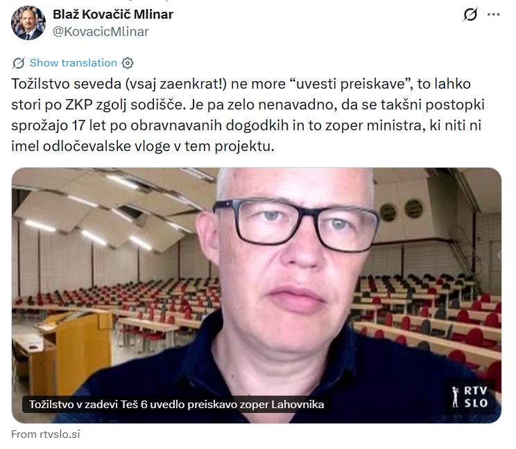 Zapisal je: “Tožilstvo seveda (vsaj zaenkrat!) ne more “uvesti preiskave”, to lahko stori po ZKP zgolj sodišče. Je pa zelo nenavadno, da se takšni postopki sprožajo 17 let po obravnavanih dogodkih in to zoper ministra, ki niti ni imel odločevalske vloge v tem projektu.”