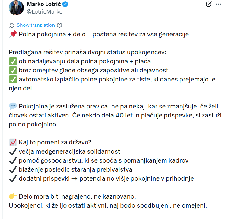 Predlog je včeraj v oddaji 24ur pojasnil Marko Lotrič, predsednik stranke Fokus. Poudaril je, da je pokojnina zaslužena pravica, ne pa nekaj, kar se zmanjšuje, če želi človek ostati aktiven. Če je nekdo delal 40 let in redno plačeval prispevke, si zasluži polno pokojnino – ne glede na to, ali se odloči še naprej delati ali ne.