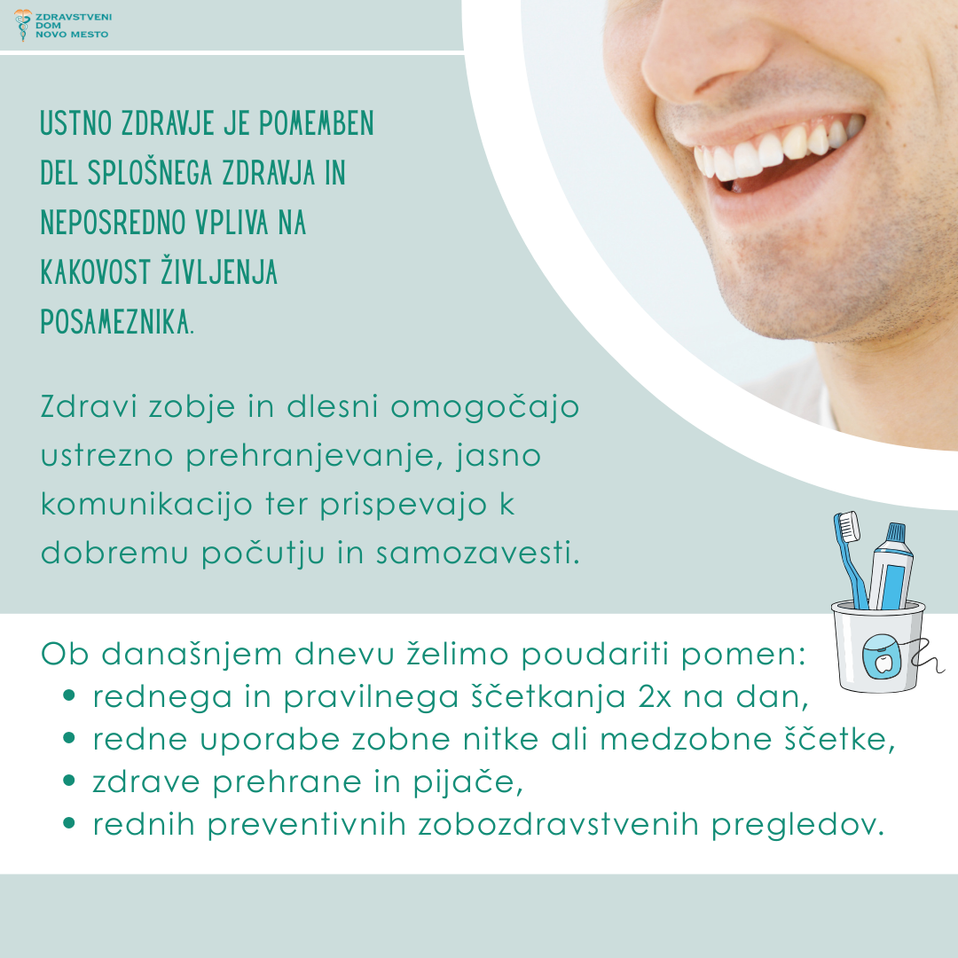 Bolezenska stanja, ki se pojavljajo v ustni votlini, še vedno prizadenejo visok delež prebivalstva. Njihov vpliv presega zgolj ustno votlino, saj je povezan tudi s splošnim zdravjem. K izboljšanju ustnega zdravja in s tem tudi splošnega zdravja lahko bistveno pripomoremo sami. Ob letošnjem svetovnem dnevu ustnega zdravja bomo v Zdravstvenem domu Novo mesto v petek 20.3.2026 pripravili stojnico, kjer bomo izvajalke vzgoje za ustno zdravje ozaveščale o pomenu ustnega zdravja na zdravje celotnega organizma. Vse obiskovalce toplo vabimo, da nas obiščejo na stojnici.