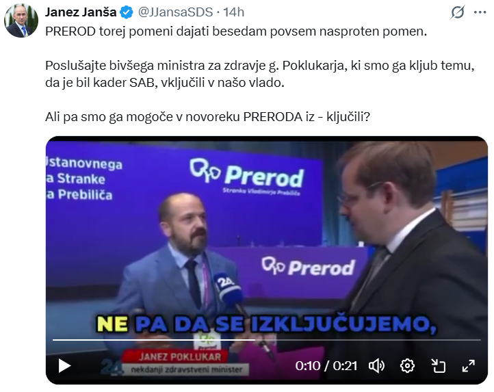 “PREROD torej pomeni dajati besedam povsem nasproten pomen. Poslušajte bivšega ministra za zdravje g. Poklukarja, ki smo ga kljub temu, da je bil kader SAB, vključili v našo vlado. Ali pa smo ga mogoče v novoreku PRERODA iz – ključili?”