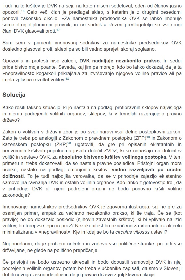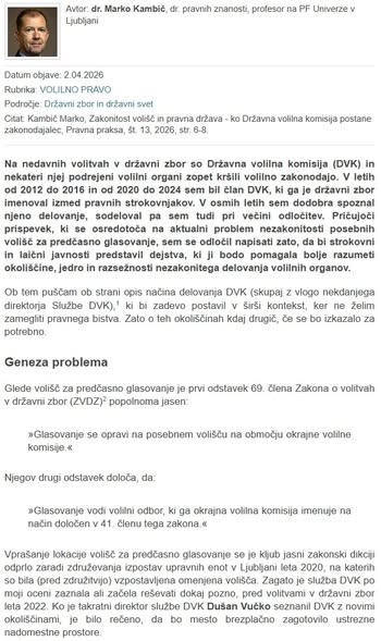 Dr. Marko Kambič, dr. pravnih znanosti, profesor na ljubljanski pravni fakulteti in dvakratni član Državne volilne komisije (od 2012 do 2016 in od 2020 do 2024, je v Pravni praksi objavil članek z naslovom Zakonitost volišč in pravna država – ko Državna volilna komisija (DVK) postane zakonodajalec.