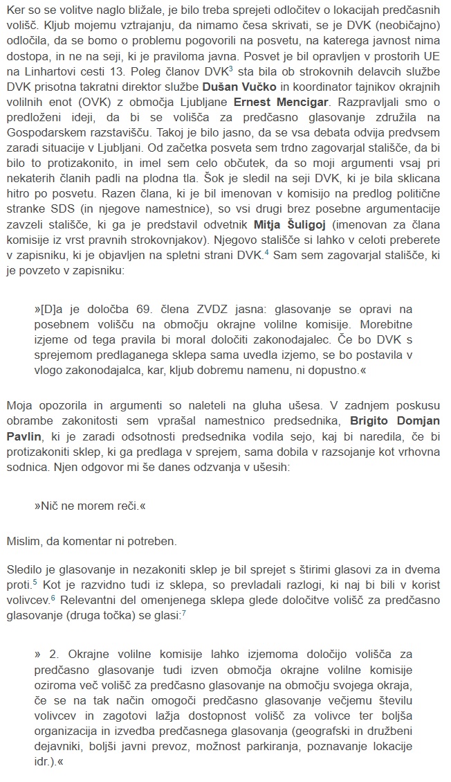Dr. Kambič je zapisal, da je v osmih letih dodobra spoznal delovanje DVK, zdaj pa se je v prispevku osredotočil na aktualni problem nezakonitostih posebnih volišča za predčasno glasovanje. Predstavil je dejstva, ki bodo javnosti, kot je zapisal uvodoma, pomagala bolje razumeti okoliščine, jedro in razsežnosti nezakonitega delovanja volilnih organov.