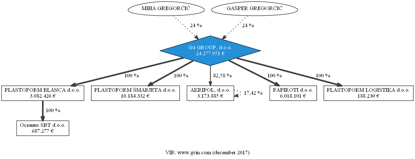 Iz lastniških povezave je razvidno, da je krovno podjetje G4 Group v 52 % lasti Franca Gregorčiča, po 24 % pa je prenesel na sinova Miho in Gašperja. G4 Group ima v lasti 24,7 milijona evrov premoženja, po 100-odstotni lastniki pa so v naslednjih podjetjih: Plastoform Blanca, Plastoform Šmarjeta, Akripol Trebnje, Papiroti (Senovo) in Plastoform Logistika (Šmarjeta). Podjetje iz Blance ima v lasti še podjetje Oceanus SBT (Kladje nad Blanco). Ob tem imajo še 93,06 % lastništva v podjetju Plastoform Istra, kar v prikazani lastniški mreži (kjer gre samo za slovenska podjetja) ni navedeno. (Vir: Gvin.com, podjetje Bisnode)