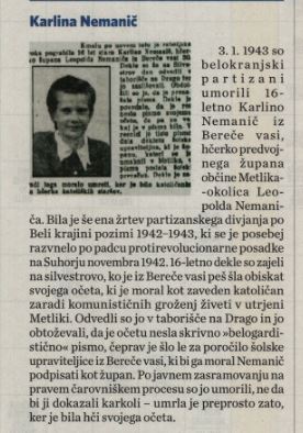 “3. 1. 1943 so belokranjski partizani umorili 16-letno Karlino Nemanič iz Bereče vasi, hčerko predvojnega župana občine Metlika – okolica Leopolda Nemaniča. Bila je še ena žrtev partizanskega divjanja po Beli krajini pozimi 1942-1943, ki se je posebej razvnelo po padcu protirevolucionarne posadke na Suhorju novembra 1942. 16-letno dekle so zajeli na silvestrovo, ko je iz Bereče vasi peš šla obiskat svojega očeta, ki je moral kot zaveden katoličan zaradi komunističnih groženj živeti v utrjeni Metliki. Odvedli so jo v taborišče na Drago in jo obtoževali, da je očetu nesla skrivno “belogardično” pismo, čeprav je šlo le za poročilo šolske upraviteljice iz Bereče vasi, ki bi ga moral Nemanič podpisati kot župan. Po javnem zasramovanju na pravem čarovniškem procesu so jo umorili, ne da bi ji dokazali karkoli – umrla je preprosto zato, ker je bila hči svojega očeta.”