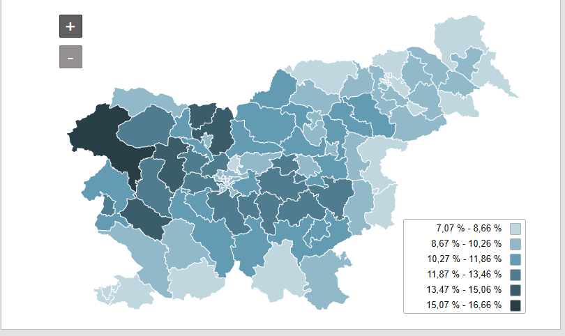 Udeležba do 11. ure po volilnih enotah (temnejše je obarvano, boljša je bila udeležba):
