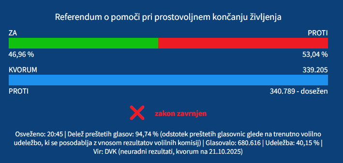 Po preštetih 94,74 % glasovnic je proti zakonu glasovalo 53,04 % vseh volivk in volivcev, za 46,96 %. Pomembno pa je, da je dosežen kvorum, proti je glasovalo 340.789 volivcev in volivk. Zakon je padel. Ali drugače: Zakon so volivci in volivke zavrnili.