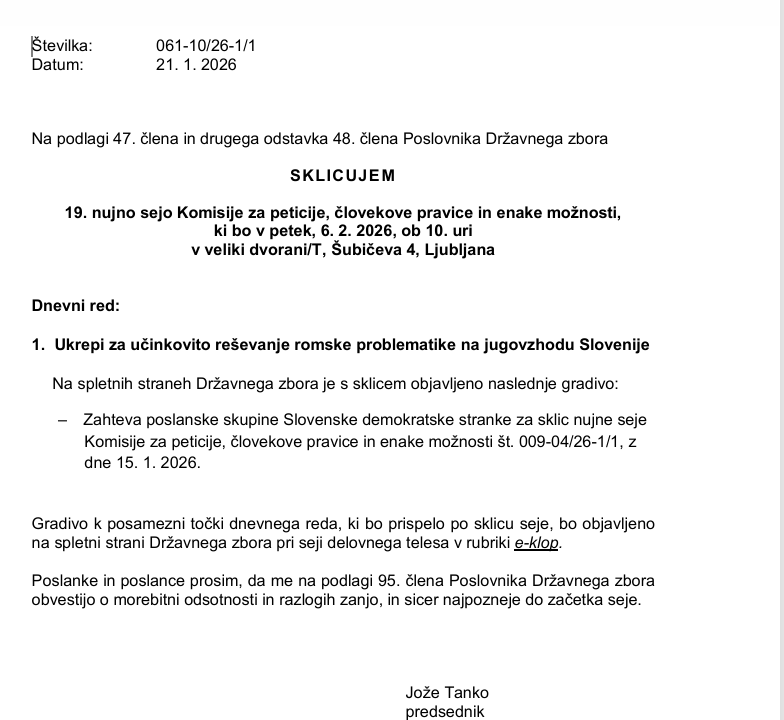 O reševanju romske problematike je v državnem zboru za 6. februar, ob 10. uri, sklicana tudi seja Komisije za peticije, človekove pravice in enake možnosti, ki jo vodi Jože Tanko. Seja je sklicana na zahtevo poslanske skupine Slovenske demokratske stranke (SDS), na seji jih bo zastopala poslanka Anja Bah Žibert. Obravnavali bodo ukrepe za učinkovito reševanje romske problematike na jugovzhodu Slovenije. (Vir)