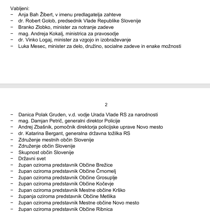 Na sejo 6. februarja so vabljeni Robert Golob, pristojni ministri, predstavniki Policije, generalna državna tožilka, predstavniki občinskih združenj, Državnega sveta, predstavniki občin, predstavniki civilnih iniciativ, predstavnik vaške skupnosti Mihovica in predstavniki romskih skupnosti oziroma združenj.