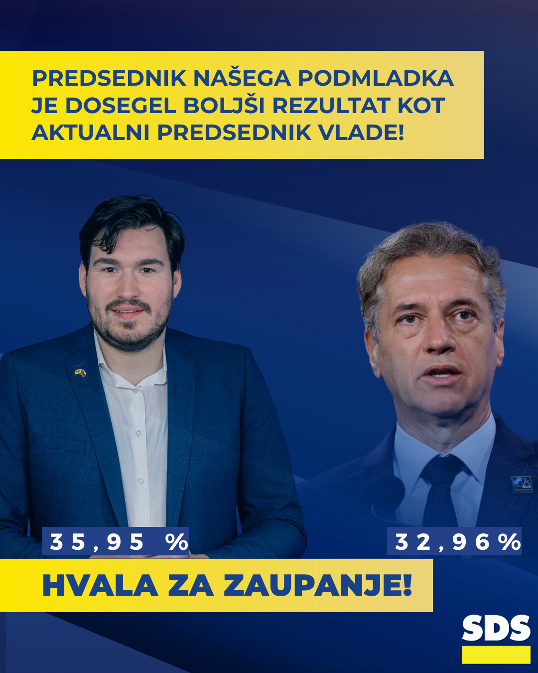 “Hvala vsem, ki ste nam namenili glas. Hvala kandidatkam in kandidatom ter njihovim štabom. Hvala vsem, ki ste v svojih okoljih pomagali odpirati oči in preko družbenih omrežij pomagali preglasiti laži,” so zapisali v SDS in dodali: “Hvala vsem, ki vam je mar za našo domovino!”