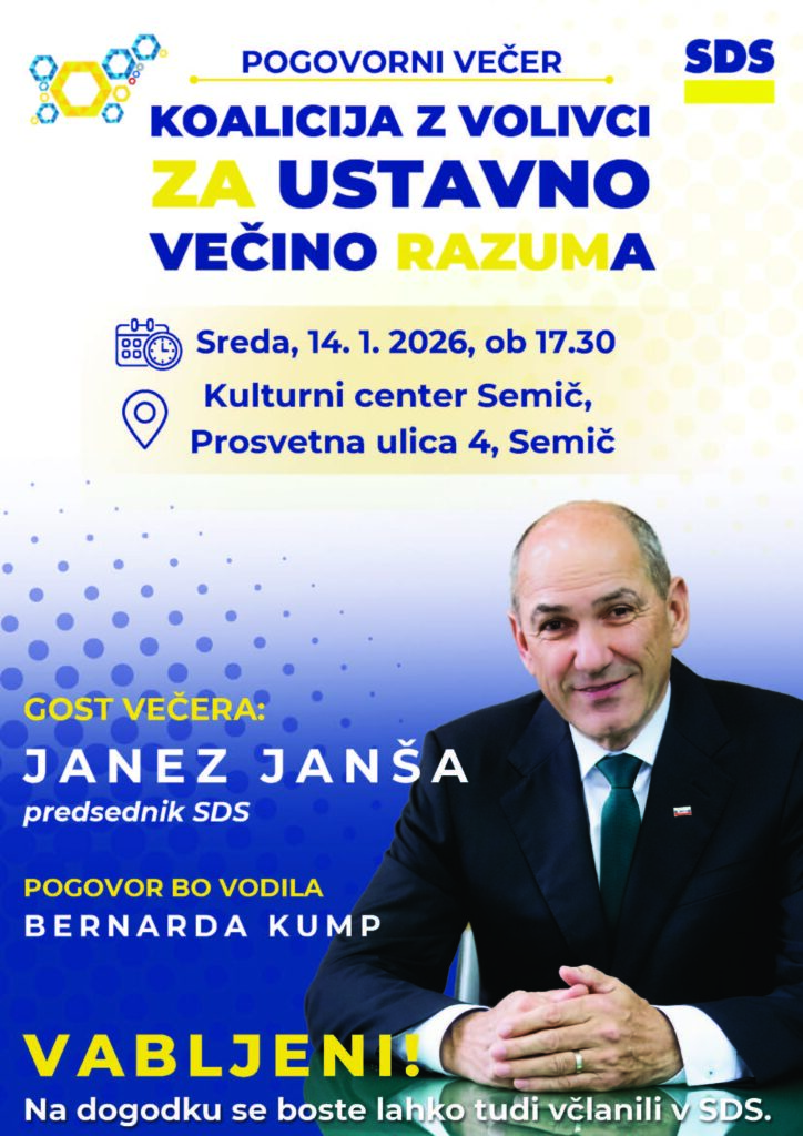 V sredo, 14. januarja, bo v Kulturnem centru Semič potekal pogovorni večer, gost bo Janez Janša, predsednik Slovenske demokratske stranke (SDS). Začel se bo ob 17.30. Vodila ga bo Bernarda Kump.