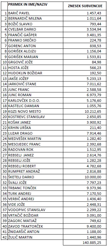 Iz preglednice je razvidno, da so subvencijo dodelili 42 osebam. Razdelili so 140.885,25 evra, kar je v povprečju po 3.354 evrov na prejemnika. Najnižji znesek subvencije je bil 84,98 evra, najvišji pa 10.212,65, kolikor je prejela Kmetijsko gozdarska zbornica Slovenije (KGZS). Med posamezniki je najvišjo subvencijo prejel Darko Šketelj (10.000 evrov).