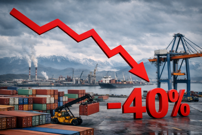 Objavljeni podatki Statističnega urada Republike Slovenije (SURS) za februar 2026 so alarmantni: izvoz blaga je strmoglavil za 38,9 %. Izvoz se je zmanjšal izraziteje kot uvoz.